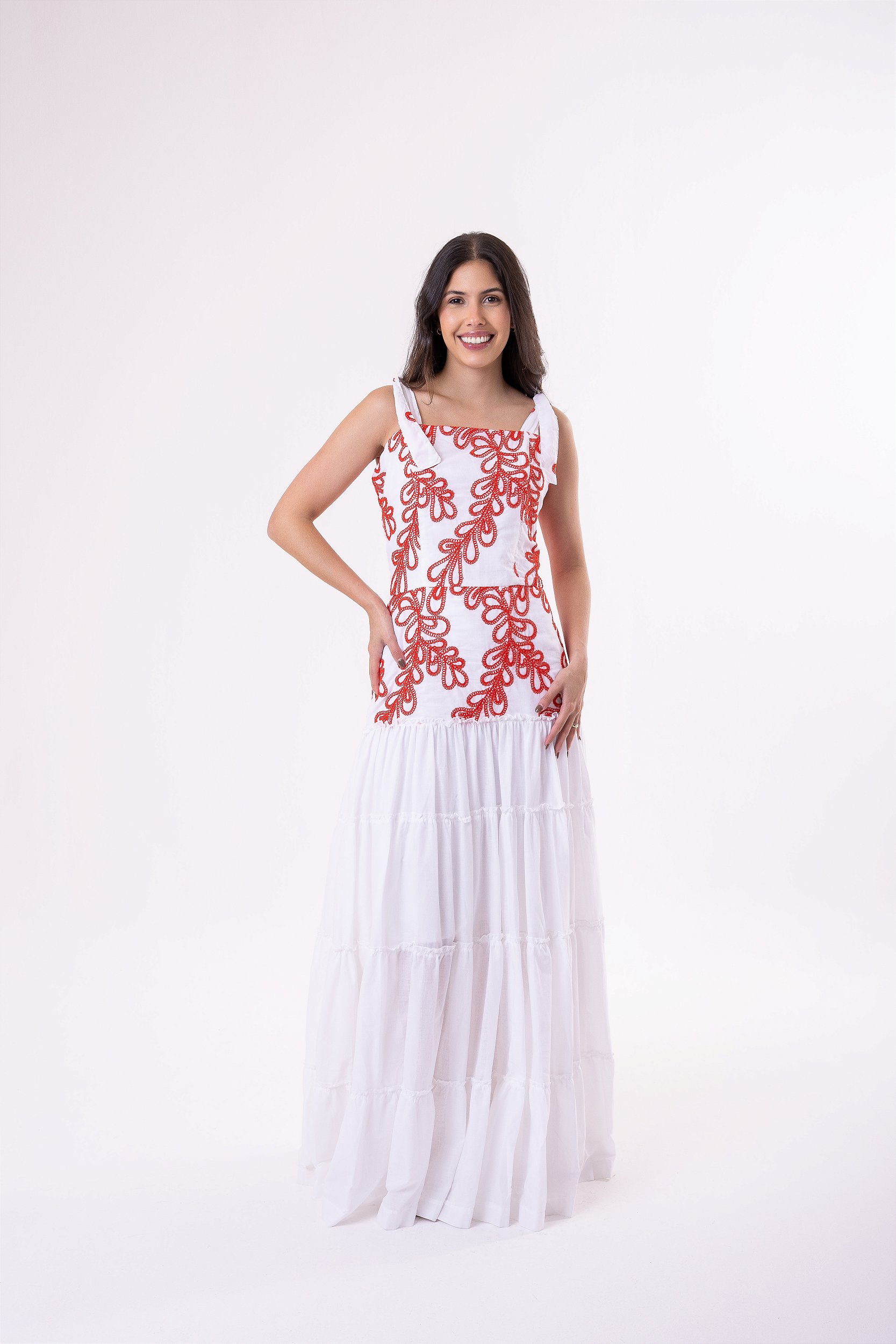 Vestido cambraia na branco com detalhes em bordado vermelho.